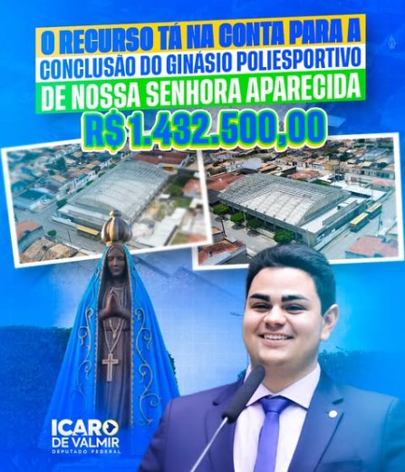 O município de Nossa Senhora Aparecida vai ganhar um importante espaço de esporte e lazer. O deputado estadual Ícaro de Valmir anunciou a liberação de R$ 1.432.500,00, através do Ministério do Esporte, para a conclusão das obras do Ginásio Poliesportivo da cidade.