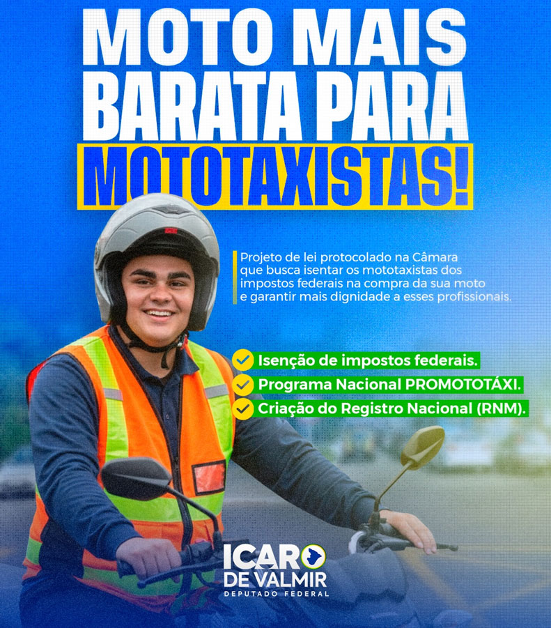 Com o objetivo de valorizar os profissionais que trabalham diariamente no transporte de passageiros sobre duas rodas, o deputado federal Ícaro de Valmir apresentou, na Câmara dos Deputados, um projeto de lei que cria medidas de incentivo e reconhecimento para os mototaxistas em todo o país.
